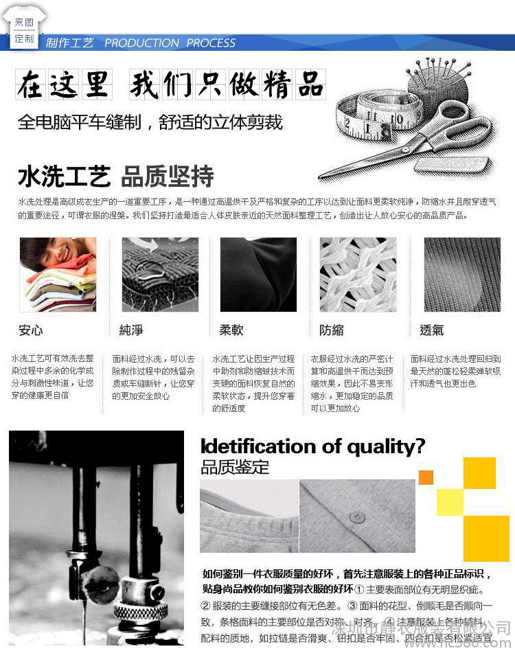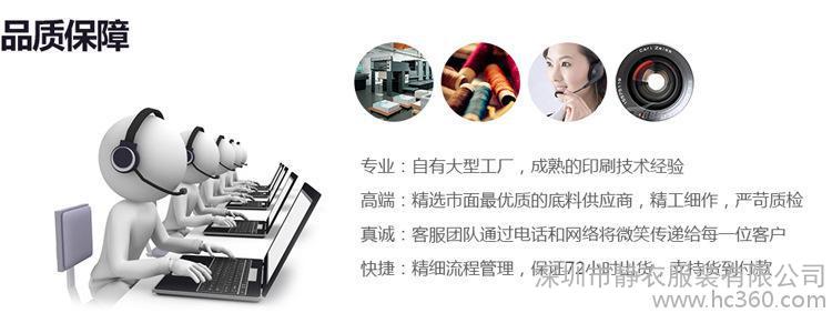 深圳市静衣服装有限公司,是一家集创意、设计、制版、生产、销售为一体的服装公司,以“统一着装,形象非凡”的产品理念,专业经营针织T恤衫、广告衫、文化衫、POLO衫系列产品。为酒店、商场、公司、工厂、银行、学校、政府等企事业单位提供专业的团体T恤衫订做服务。等经过多年的发展历程,现已拥有齐全的进口专机设备与一条稳固的生产流水线,并配有专业的技术管理人员与客户服务团队,公司每件服装都经过多道服装工序生产(采购**原材料,细致的剪裁,裁片印花刺绣,专业熟练的车工细致制作,产品检验后)由后道工序进行(钉扣,剪线,大烫高温熨烫,产品包装每件产品独立保证**出成品工作服)公司以过硬的质量、优惠的价格、高效率的订做与良好的售后服务,秉着“站在客户的角度着想,努力为客户降低成本,用效率与诚意打动客户”的工作理念,受到广大客户的一致好评,公司目前与佛山、广州、中山、深圳等多家面料、辅料供应商形成稳定的战略合作关系,并在业内拥有良好的口碑。可以根据贵公司的要求,为您制作有贵公司特色的服装。公司全体同仁欢迎国内外客户来电来样洽谈,并感谢您选择我们的服务。 产品介绍:1>工装,工作服,职业装,衬衣,工衣,厂服,翻领T恤、圆领T恤、文化衫、LOGO衫、POLO衫、广告衫、丝光棉**T恤、商务T恤衫、时尚T恤衫、情侣T恤衫、个性T恤衫、定做T恤、T恤定做、纯棉T恤批发、短袖T恤定做、厂服定做、工衣定做、空白文化衫等2>丝网印花、电脑刺绣花、热转印、烫画、个性印花、水印、胶印等质量方针:质量是企业信誉的标志,质量是开拓市场的**。质量是企业生存发展的保证,没有质量**没有效益。深圳市静衣服装有限公司的诚信、实力和产品质量获得业界的认可。欢迎各界朋友莅临参观、指导和业务洽谈。