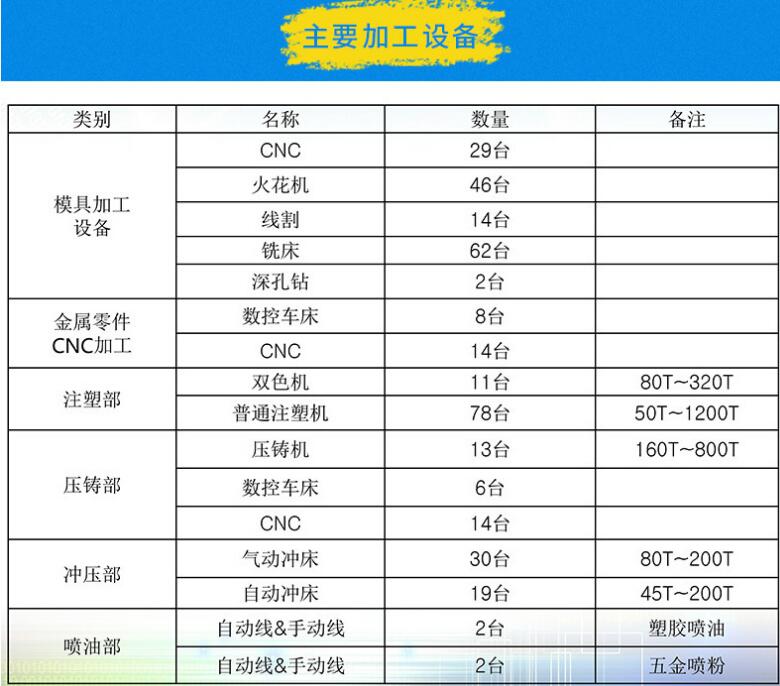 | 主要加工设 | 注塑机、锣床、车床、磨床、火花机等 |