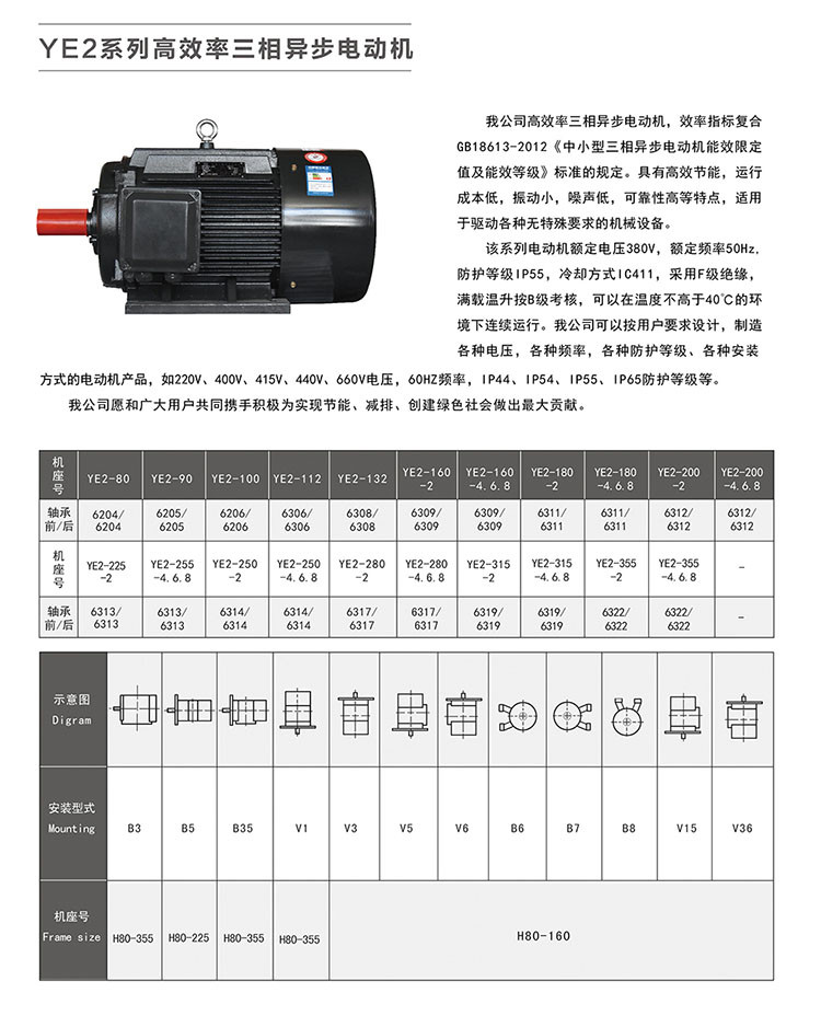 我公司高效率三相异步电动机,效率指标符合GB18613-201《中小型三相异步电动机能效限定值及能效等级》标准的规定。该系列电动机具有高效节能,运行成本低,振动小,噪声低,可靠性高等特点,适用于驱动各种无特殊要求的机械设备。 该系列电动机额定电压380V,额定频率50Hz,防护等级IP55,冷却方式IC411,采用F级绝缘,满载温升按B级考核,可以在温度不高于40℃的环境下连续运行。我公司可以按用户要求设计,制造各种电压,各种频率、各种防护等级、各种安装方式的电动机产品,如220V、400V、415V、440V、660V电压,60Hz频率,IP44、IP54、IP55、IP65防护等级等。 我公司愿和广大用户共同携手积极为实现节能、减排、创建绿色社会做出**大贡献。