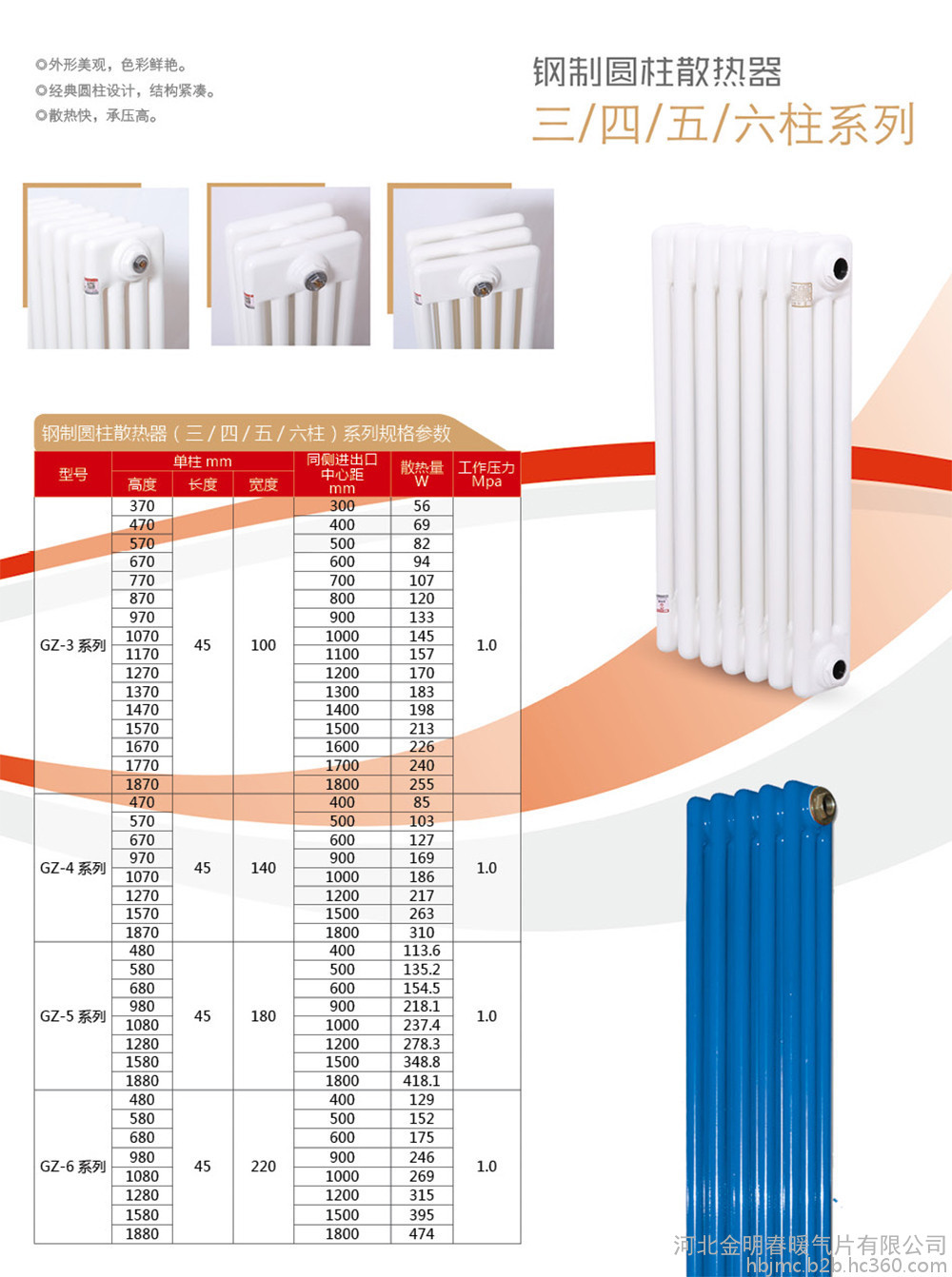 钢四柱暖气片是由四根圆管焊接成的单柱型暖气片,其样式雷同于钢三柱产品,只是多一个柱子而已。其特点具有大的水容量,耐用,并且具有相对高的温度,特别是在具有中央供暖的区域中。当偶尔发生间歇加热时,水的量也可以通过其自身的热量长时间保持。当加热关闭时,钢四柱暖气片的冷却时间也更长。可适用于:一些大中小公共建设,办公大楼及普通住宅中,比如,学校、医院、工厂、图书馆**、宿舍楼、洗浴中心、酒店、商业办公楼等地。