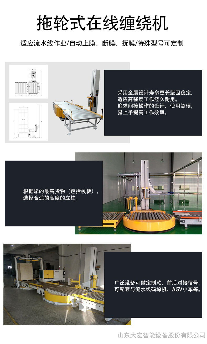 大宏拖轮式在线缠绕机以拉伸膜/缠绕膜为包装材料,应用于托盘/栈板包装,采用缠绕机将托盘货物的商品进行包装,利用拉伸膜的回缩性和自粘性将货物和托盘束缚成整体,起到固定的作用,因而货物不会发生散包和倒塌现象,对货物还能起到防尘、防潮、防破损作用。在线缠膜机是专用于流水线作业的,设备自动上膜、断膜、抚摸,前后都可直接对接信号。