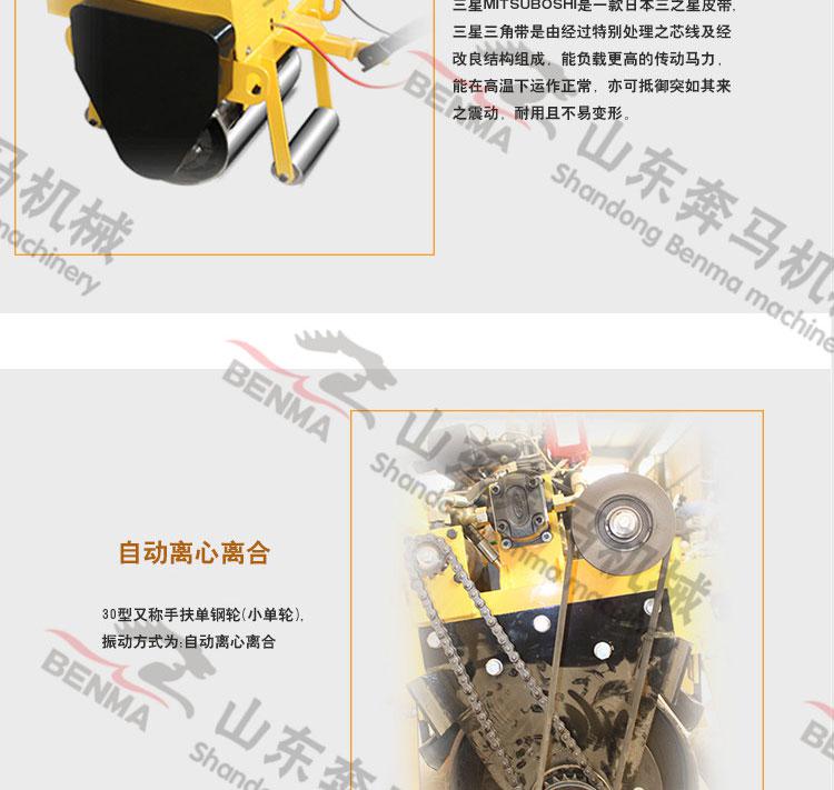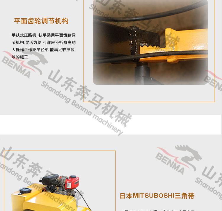 小型手扶压路机的主要特点**是体积小,操作灵活,它适用于各种小型的施工工程中,针对一些狭窄的施工区域进行压实,由于它价格不高,性价比高也常用于工厂自用,像马场的压实工作,砖厂用来压场地,以及自建工厂的地基压实工作等。它采用正宗全国联保的发动机,柴油汽油发动机都可以根据您的需要任意选择;进口的轴承及三角带,故障率低,真正性价比高,价格不高,又经久耐用的设备!