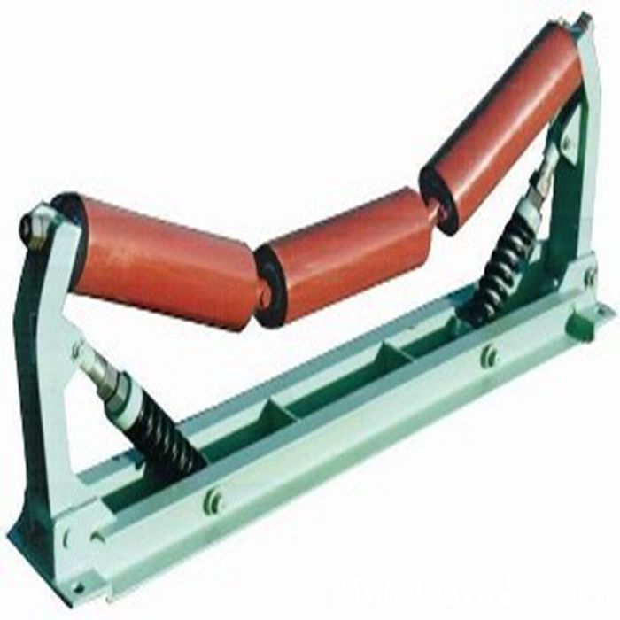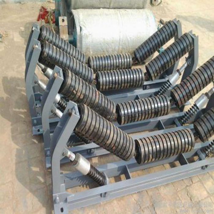 缓冲托辊安装在输送机受料段的下方,减小落料时物料对输送带的冲击,以延长输送带的使用寿命.缓冲托辊的间距一般100-600毫米。