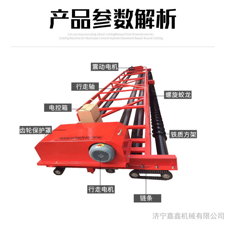 嘉鑫摊铺机参数:型号: HZP219总功率(kw) 13摊铺宽度(m) 3-8行驶速度(m/min) 9-12整机重量L=6m(kg) 1300外形尺寸(mm) 3000-8000x1400x830