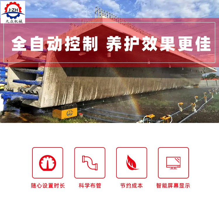 九众机械设备有限公司新研发生产的高铁、铁路、高速公路、高标准快速路预制箱梁采用智能喷淋养护系统进行全自动智能化浇水养护成为*的行业科技趋势。公路T型梁、高铁箱梁、铁路箱梁通过建设喷淋基座,通过预埋美原装进口高品质伸缩旋转喷头,实现标准化养护,4分的出水口径相比其他厂家6分的口径更省水,北方干旱地区的制梁场优势更显著。可设置循环养护喷淋间隔,可灵活设定喷淋时间段,省水、节电,也可以根据用户实际需求连接降雨传感器每两小时一次的天气信息调节用水量,可智能调整喷淋养护时间,精养护及用水记录云服务为高标准公路工程建设插上美丽的翅膀,并可轻松实现节约30%喷淋养护成本的目标。智能控制箱可以人工操作也可以设定自动养护时间间隔和时长。