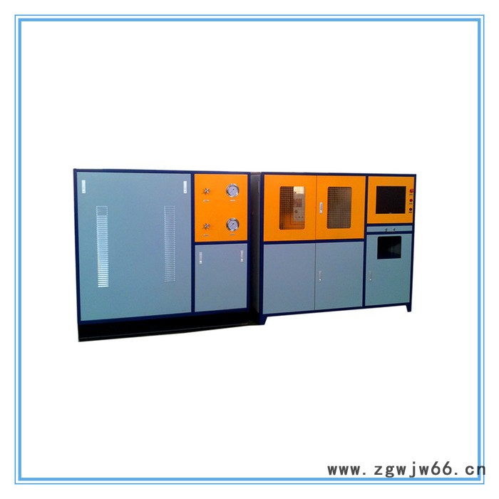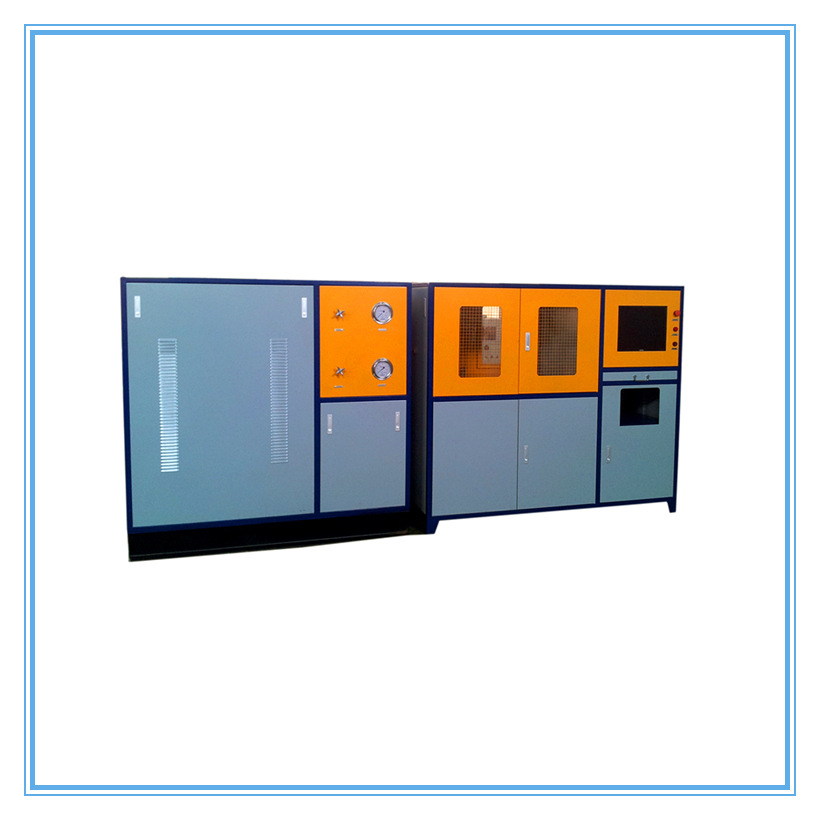 整个设备由两部分组成,计算机控制及动力源箱体部分和试验箱体及水箱部分。由计算机设定试验参数,压力传感器检测系统压力,经过数据采集卡进入计算机,计算机捕捉爆破峰值,计算机操作控制整个测试过程。