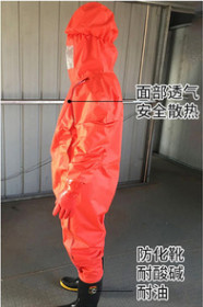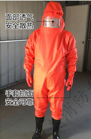 重型防化服(内置式),采用高强棉纶绸布双面涂覆改性氯化丁基橡胶制成的胶布、高强聚碳酸脂大视野镜片、密封拉链、绝缘耐刺胶靴等连体式结构。配合空气呼吸器、无线电对讲机、报警器使用,可与周围环境完全隔离,穿脱快捷,完全可以取代进口防化服。是现代化工、核防护、消防防化装备中综合性能的特种个人防护装备。