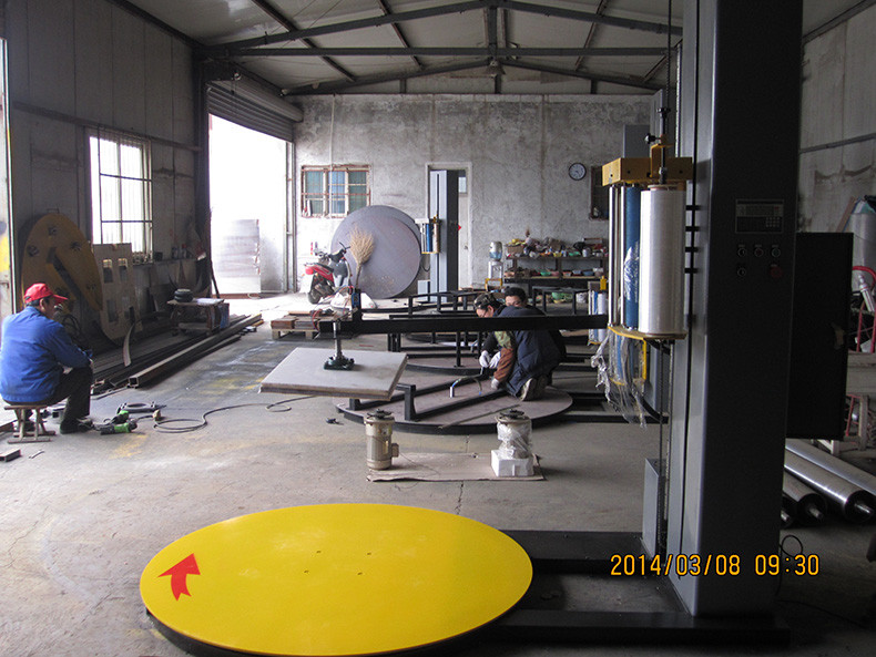 缠绕机械工作原理是将被缠绕物体放置于转盘中央,启动转盘电机转动,自然地带动转盘转动,使物体实现了外围的缠绕膜机。与此同时升降机电机也启动,带动缠绕捆扎机整个组合体做上下运动,达到物体高度方向的缠绕,这**实现了物体整个外表的缠绕包装。这样不仅有利于货物储存、运输及机械化装卸作业的包装要求,又能防止货物在搬运过程的损坏,起到防尘,防潮及保洁作用,也降低了生产成本,提高了生产效率。在缠绕过程中主要的是对薄膜拉紧力的调整以及穿膜。一般通过调整转盘转速和调节电机的转速**能达到薄膜张紧程度。只要知道转盘转速大于电机转速,膜**会越紧,反之越松这个原理**不难操作了。