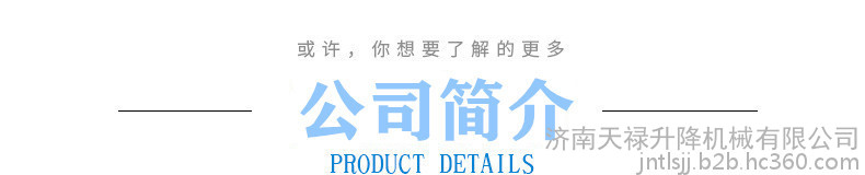 济南天禄升降机械有限公司坐落在辽阔的齐鲁大地,环境优美,人杰地灵,公司位于济南市以北新兴的工业区------济阳开发区内,交通便利,四通八达。是国内一家集制造、研发为一体的企业,目前专心致力于液压升降平台领域。公司主要产品有:剪叉移动式升降平台,剪叉固定式升降平台、套缸式升降平台、铝合金直臂升降平台、折臂式升降平台、曲臂式升降平台、车载式升降平台、导轨链条式升降货梯系列。公司汇集了许多学科的专业人才,以真诚合作的精神,不懈地推进新技术的应用和创新。我们努力把**技术、**质量的产品推介给用户。客户的效益是我们的目的,客户的满意是我们的追求。