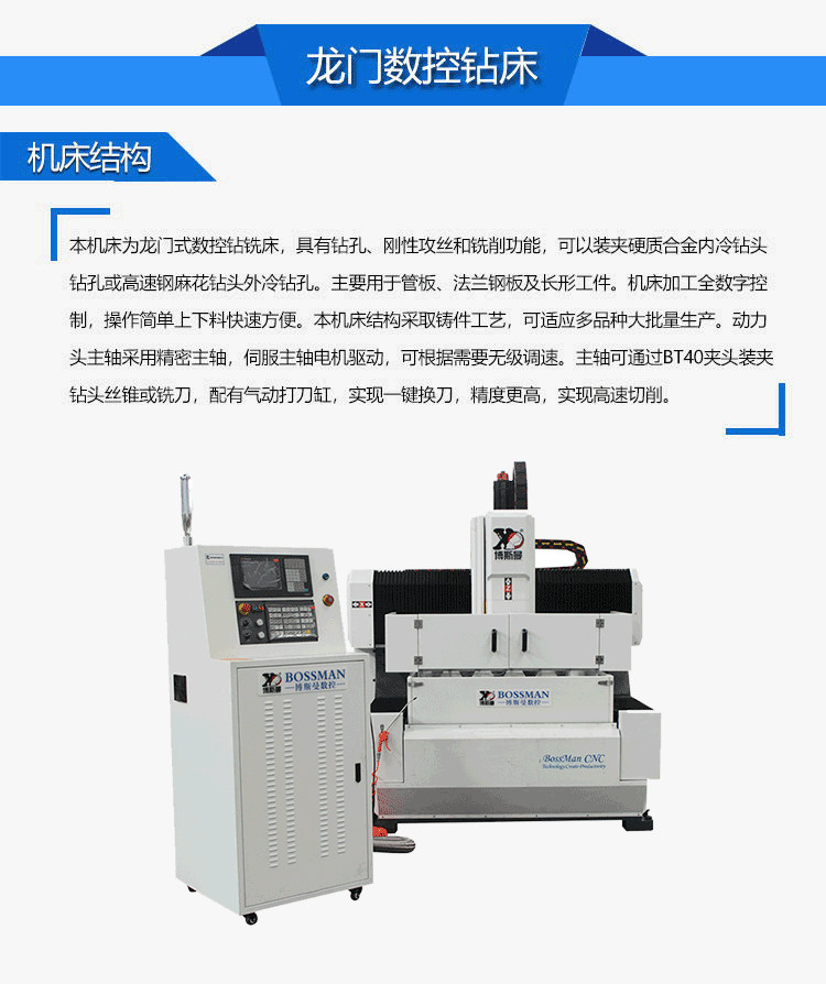 本机床为龙门式数控钻铣床,具有钻孔、刚性攻丝和铣削功能,可以装夹硬质合金内冷钻头钻孔或高速钢麻花钻头外冷钻孔。主要用于管板、法兰钢板及长形工件。机床加工全数字控制,操作简单上下料快速方便。