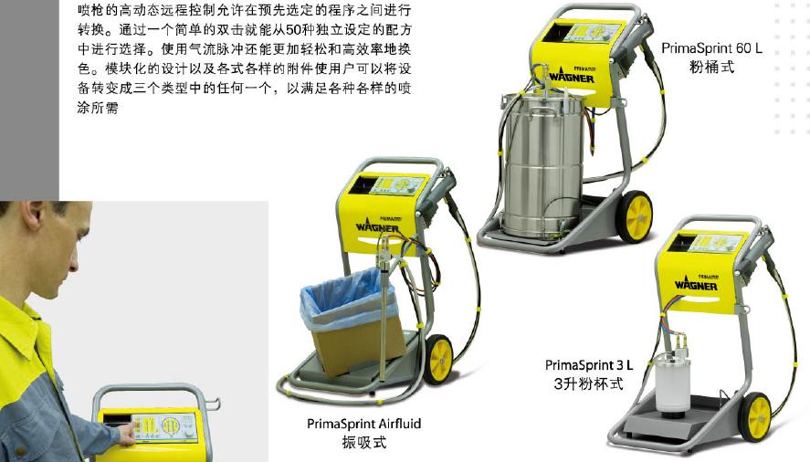 喷枪的高动态远程控制系统允许在预先选定的程序之间相互转换;使用气流脉冲可以高效迅速换色;50种独立设定配方任意选择;