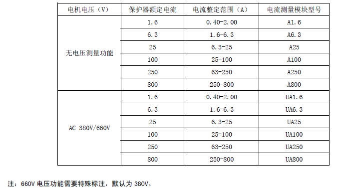 保护功能:过载、断相、堵转,欠压、过压保护等;起动方式:保护模式、直接起动、星三角;显示为液晶显示。电机大小:5.5kW,电压为 AC660;通讯功能为 PROFIBUS;带有 4-20mA 变送输出;带有 PT100 测温,用于测量电机绕组、轴承温度,并可做温度过热保护;带有漏电保护,测量范围 50mA~1A,需要漏电互感器AKH-0.66/L-35351A/2mA。对应型号为:“ARD3T- K1 UA25- T 2M CP L1 60L 电压为 660V”