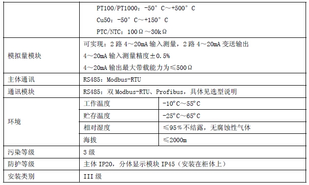 8、 增加模拟量模块后,可以实现 4~20mA 输入测量、4~20mA 变送输出。可以实现 4~20mA 输入保护。变送输出类型包括:A、B、C 相电流;AB、BC、CA 线电压;频率;有功功率;主体 PTC;温度模块三路温度输入;模拟量模块 2 路模拟量输入。