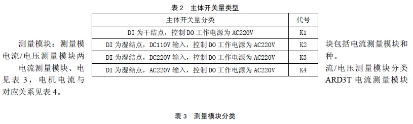 主体开关量为 4DI、4DO,主体开关量类型如表 2 所示:如需带有电压功能时,将表 4 中“ARD3T 电流测量模块”对应型号更改为“UAXX”,例如:需要电机为 5.5kW,带电压测量功能,根据表 4 查询对应测量模块为“A 25”,直接替换为“UA25”。