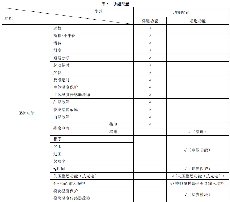 保护功能:过载、断相、堵转,欠压、过压保护等;起动方式:保护模式、直接起动、星三角;显示为液晶显示。电机大小:5.5kW,电压为 AC660;通讯功能为 PROFIBUS;带有 4-20mA 变送输出;带有 PT100 测温,用于测量电机绕组、轴承温度,并可做温度过热保护;带有漏电保护,测量范围 50mA~1A,需要漏电互感器AKH-0.66/L-35351A/2mA。对应型号为:“ARD3T- K1 UA25- T 2M CP L1 60L 电压为 660V”