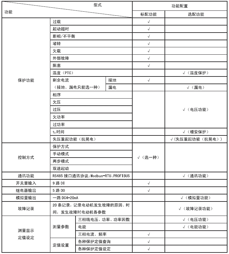 注:标配功能:电流参数、起动超时、过载、堵转、阻塞、欠载、断相、不平衡、剩余电流(接地/漏电)、温度、