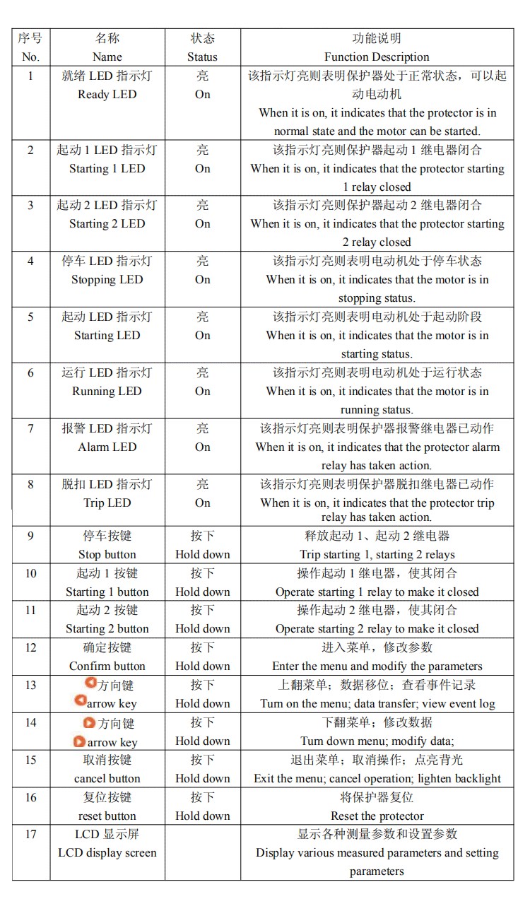 注:标配功能:电流参数、起动超时、过载、堵转、阻塞、欠载、断相、不平衡、剩余电流(接地/漏电)、温度、