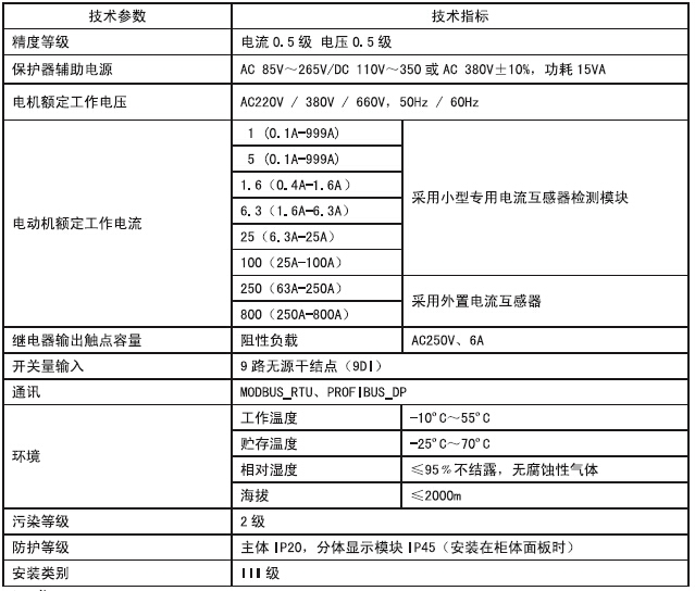 注:标配功能:电流参数、起动超时、过载、堵转、阻塞、欠载、断相、不平衡、剩余电流(接地/漏电)、温度、