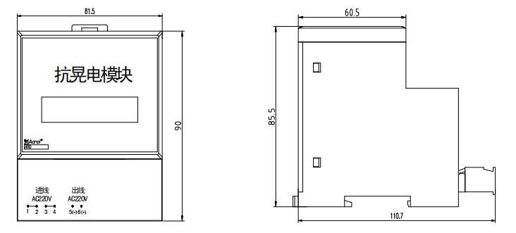 互感器部分(保护器电流规格为250A时所配电流互感器) 互感器部分(保护器电流规格为800A时所配电流互感器) 漏电互感器 4.3显示模块外形尺寸 4.4AC380V电源模块 4.5抗晃电模块 4.6 90L显示模块面板