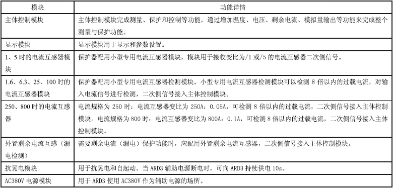 3.2产品组成 保护器主要由主体控制模块(保护控制功能)、显示模块和互感器模块(电流检测)组成,用户可根据需要选配抗晃电模块或 AC380V 电源模块。 3.3功能配置 四、外形及安装尺寸