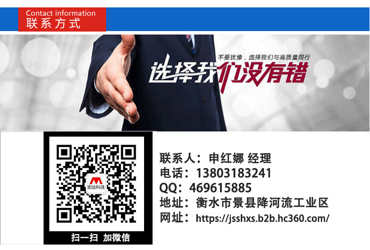 衡水密达科技有限公司是一家中型橡塑制品企业,本厂位于河北省景县将河流镇工业园区,京沪高速20公里,京九铁路20公里;铁、公路交通运输都非常便利。本厂始建于1980年,是以生产销售水泥罐车配件卸灰管、水泥罐车配件阀门、水泥罐车配件接头、水泥罐车配件密封圈、金属软管、空压机及配件、抱箍系列等为主的企业。本厂产品相继服务于国内各大型钢铁厂、煤矿、冶金、电力、船舶、化工、油田、水泥厂、机械制造、散装汽车制造等领域。 经多年对人员和技术的改革,现已崭新的企业形象面向全国新老客户。??公司是依科研和开发为主的橡胶制品生产实体,技术力量雄厚,生产设备先进,拥有国内先进的、压延成型机、硫化机等成套生产设备;检测手段齐全,有独立的实验室,各环节基本上实现了自动化流水线生产,公司利用ISO9002质量管理体系,制定了一整套科学的、严格的、实用的企业内控标准管理和监督产品质量。以我公司技术人员开发出来的输送带、提升带、胶件以及橡塑制品的各项指标均达到GB7984—87、新标准GB7984—2001,产品畅销全国三十多个省、市。并获得了重合同首信用、执行政策先进单位等荣誉称号。