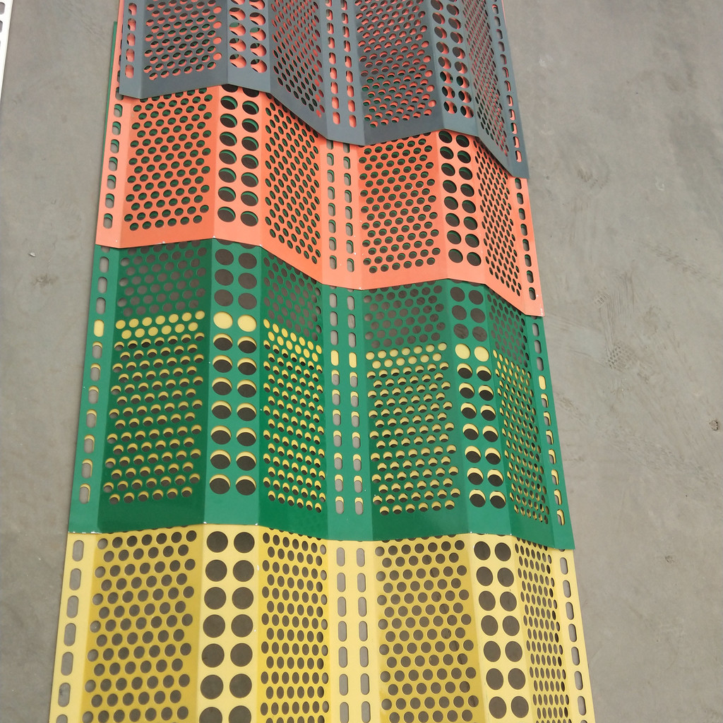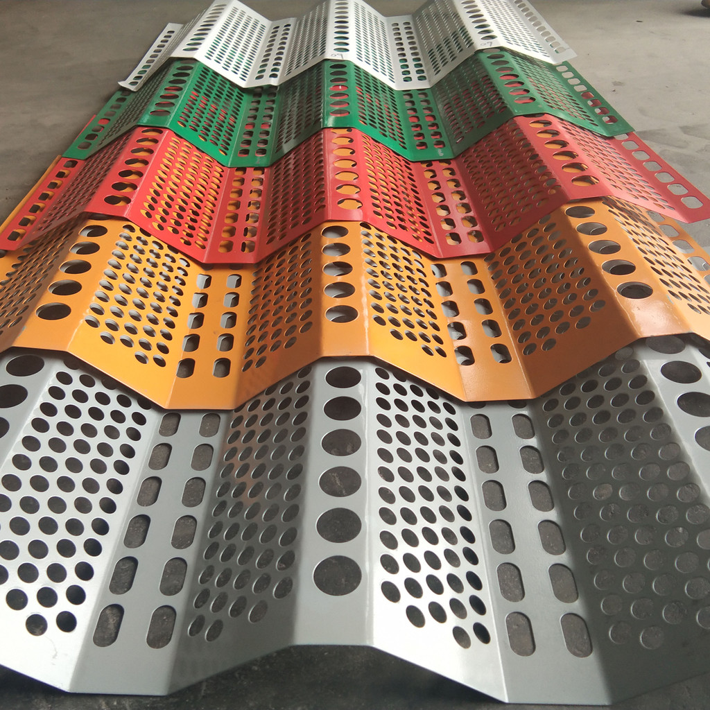 防风抑尘网是利用空气动力学原理,按照实施现场环境风洞实验结果加工成一定几何形状、开孔率和不同孔形组合挡风抑尘墙,使流通的空气(强风)从外通过墙体时,在墙体内侧形成上、下干扰的气流以达到外侧强风,内侧弱风,外侧小风,内侧无风的效果,从而防止粉尘的飞扬。