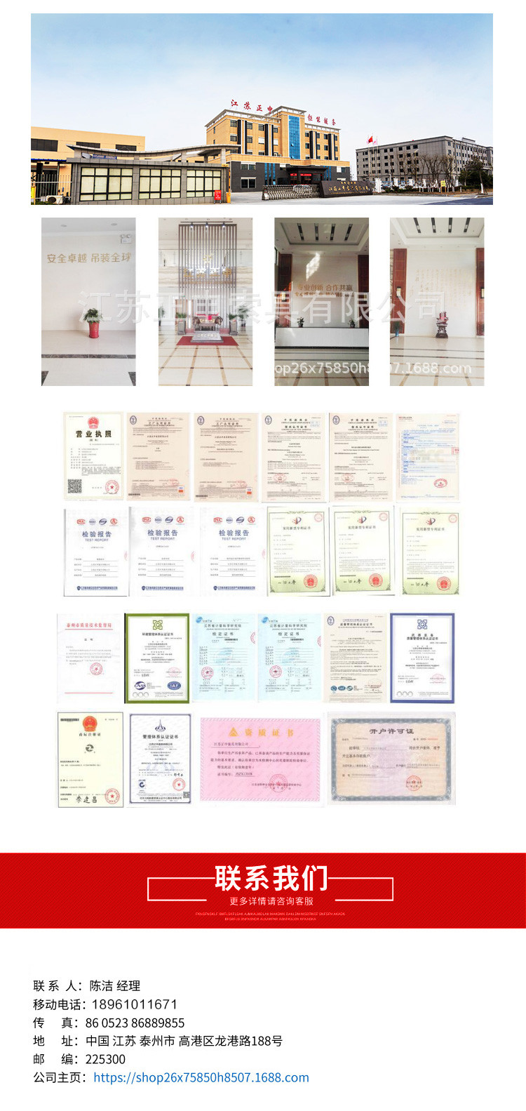 江苏正申索具有限公司成立于2001年,厂区占地面积33000平方米,员工1600多人,是集索具设计、生产、销售为一体的专业化吊索具公司。主要产品有各种规格型号钢丝绳、钢丝绳吊索具、合成纤维吊装带、尼龙编织绳、链条吊索具、钢板起重钳、冶金夹具、吊粱、索具配件等.产品广泛应用于机械、冶金、石油、化工、港口、造船等领域。公司产品由中国人民财产保险公司承担产品质量责任保险。 主要用户为国内太型国企如首钢集团、中国一重、上海国际港务集团、上海电气集团、东方电气集团等.产品缝合性能得到了用户的高度评价。