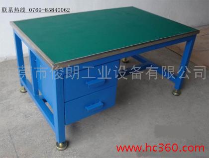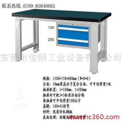 6、工作台可加装挂板,电器板,灯顶板、搁板等桌上部件,具有多种选择,能够满足各种工位的需求。工作台 工作台采用**冷扎板精工制作而成,坚固的工作桌框架,牢固平稳,可使工作桌承重1000kg;多种工作桌面选择,可配合不同工位使用的要求;工具吊柜(箱),侧柜(箱),外形美观;层板,抽屉质量上乘,承重大,抽屉内可根据需要任意分隔;节约空间,适用性强。工作台详细信息 ▓耐冲击桌板特性 ○桌板使用高压成型纤维板,表面黏贴绿色软性压纹特殊合成胶皮, 桌面四边并以PVC长型胶条封边,以保护桌边不易受损。 ○耐冲击、吸震、美观,适合一般工厂钳工作业、机具维修、 生产线包装与保养厂作业及其它用途使用。 ▓ 耐磨桌板特性 ○桌板使用高压合成板,表面黏贴灰色皮纹面热固性树脂高压板, 桌面四边并以PVC长型胶条封边,以保护桌边不易受损。 ○耐磨,适合一般电子工厂、研究所、实验室、医院、学校作业、 仪器存放、检测作业、维修等用途。 ▓ 原木桌板特性 ○桌板使用榉木与防水胶经加压制造而成。 ○表面光滑平整,美观不易变型,耐油、耐热、耐酸、耐碱, 适合一般工厂作业与精密模具维修,仪器置放与检测等用途。 ▓ 不锈钢桌板特性 ○桌板使用高压合成板,表面包1.2mm砂面不锈钢板,以达美观耐用。 ○耐高温、耐磨损、耐油、使用寿命长,为多功能桌板, 适合一般工厂、食品业、研究室、电子厂无尘室使用。 轻型工作台可承重500KG 重型工作台可配置工具柜,重型工作台桌面可承受1000