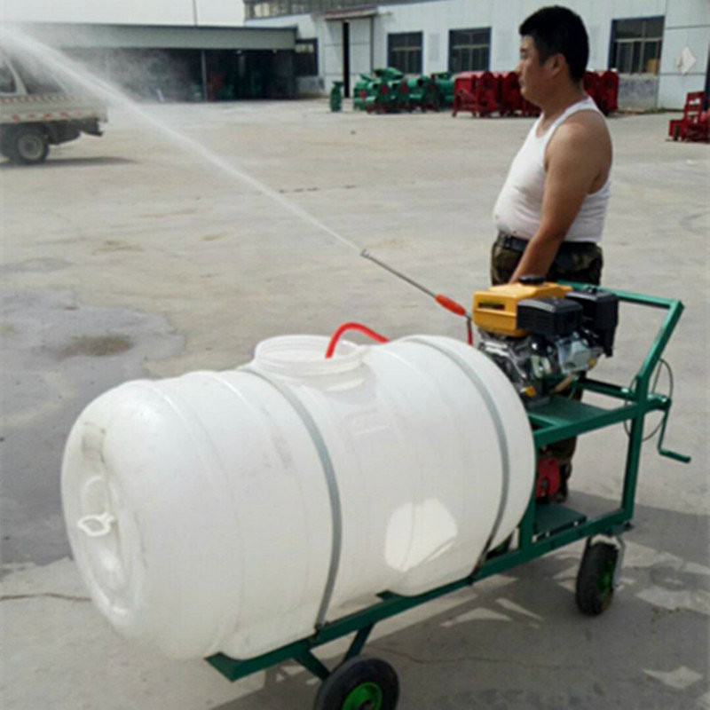 手推式四轮喷雾打药机,牧草打药机 园林喷雾器 手推式动力喷雾器,又称为四冲程喷雾机,属于高压喷雾器系列。以汽油机为动力,高压柱塞泵为工作源,应用专用喷雾高度可以达到垂直喷雾25米。如果需要更高喷雾,可延长高压胶管绑在长杆上工作。