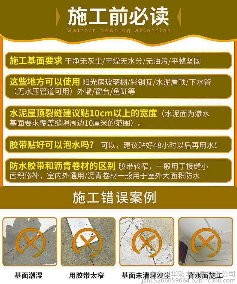 本产品采用进口橡胶配合先进工艺生产而成,具有优良的粘附力和密封性能。是一种绿色环保、无毒无味的自粘型防水材料。具有耐高温和耐低温性能,高温110度不流淌,低温40度不开裂。’抗拉强度高、弹性、延伸性能好,可避免其他材料因外界的变形而开裂。使用范围广泛,哪里需要**贴哪里,对任何物体表面都有粘贴性。只要保持结面的干燥,清洁即可,对水泥,金属,木材,卷材,塑料等都有非常有益的粘贴性。不用借助任何工具,直接粘贴即可!