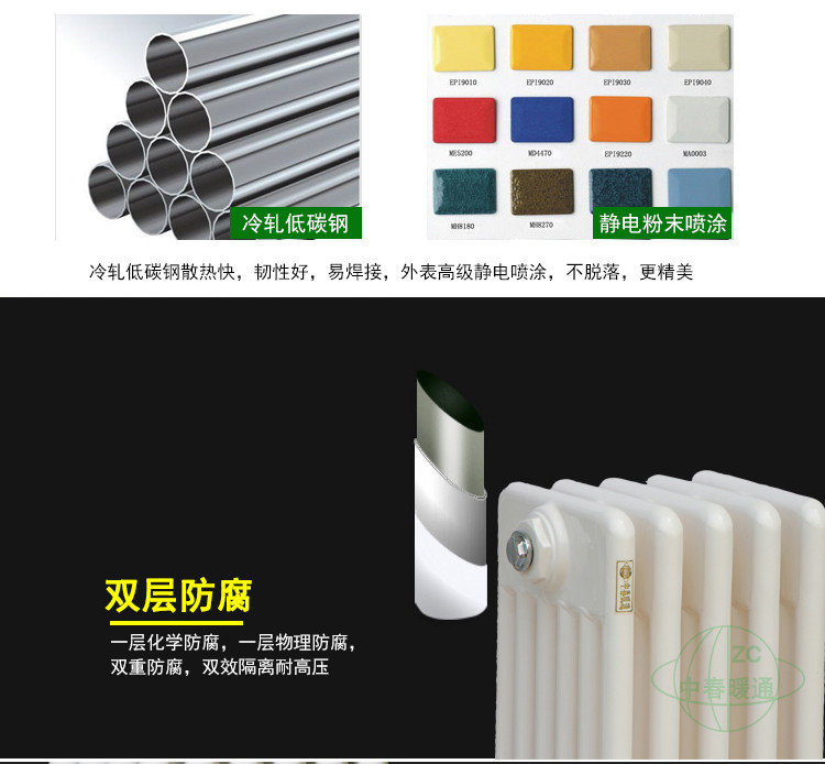 钢制柱型散热器的外观新颖,结构合理,散热能力卓越,适用于各种闭式热器供暖系统。选材考究,选用优质低碳精密钢管;焊接质量可靠,采用国际领先的“全自动数控双气体保护焊”生产工艺。热稳定性非常好,散热非常高;内腔洁净,涂有优质内防腐涂层,使用寿命很长;承压能力高;整体造型简洁,结构简单,安装和维护极为简便。适合各种高层建筑和中、高档住宅和办公场所。