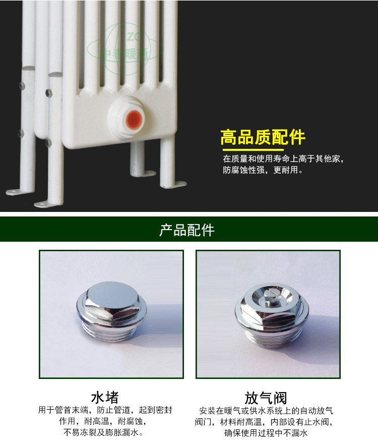 散热器按行业标准结合顾客要求组织生产。产品按管径分为¢25、50*25、60*30椭圆管三种,按单片中的柱数分为2柱、3柱、4柱、5柱、6柱五种,进出水口中心距,颜色和长度有多种供顾客选择,产品按多片联接成组出厂。散热器外表采用先进的静电喷塑和烘干等工艺,色彩亮丽,经久耐用,清洁方便。