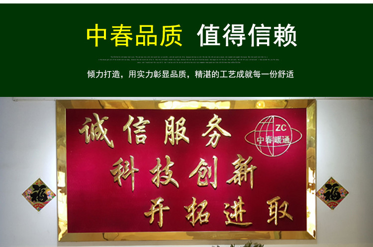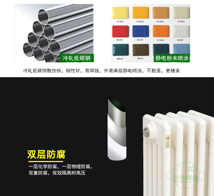 散热器按行业标准结合顾客要求组织生产。产品按管径分为¢25、50*25、60*30椭圆管三种,按单片中的柱数分为2柱、3柱、4柱、5柱、6柱五种,进出水口中心距,颜色和长度有多种供顾客选择,产品按多片联接成组出厂。散热器外表采用先进的静电喷塑和烘干等工艺,色彩亮丽,经久耐用,清洁方便。