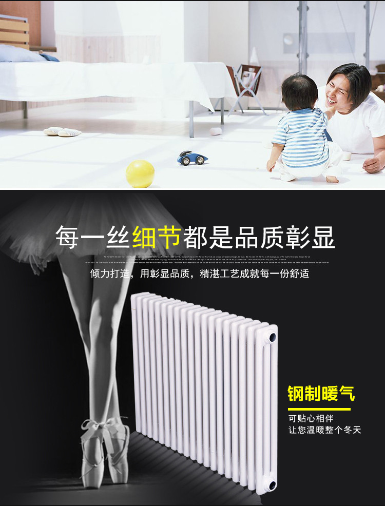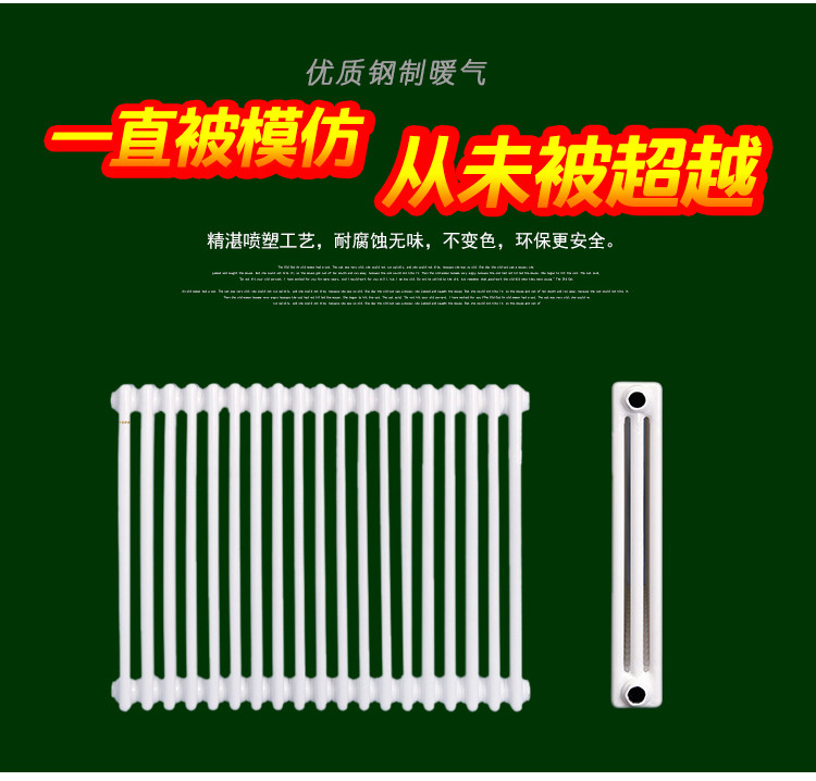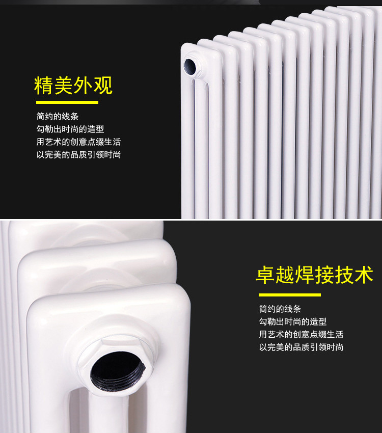 散热器按行业标准结合顾客要求组织生产。产品按管径分为¢25、50*25、60*30椭圆管三种,按单片中的柱数分为2柱、3柱、4柱、5柱、6柱五种,进出水口中心距,颜色和长度有多种供顾客选择,产品按多片联接成组出厂。散热器外表采用先进的静电喷塑和烘干等工艺,色彩亮丽,经久耐用,清洁方便。