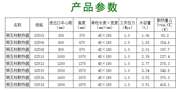 产品: 浏览次数:629中春 钢五柱散热器 GZ-5系列钢柱散热器 钢柱参数 QFGZ509钢五柱 中心距900mm 钢柱散热器承压能力