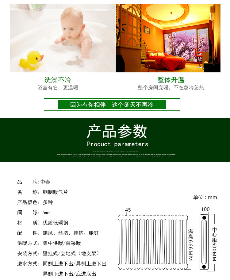 (2)更低能耗,更多省钱采用辐射散热与强制对流散热相结合的原理,设计合理,散热表面积大,大大提高了散热器的热工效率,降低了能耗,同等室温,同等散热效果下,铸铁、钢制片头,双搭散热器的热水用量是该产品的2-3倍,该产品节约能耗50%以上,让用户采暖更省钱。