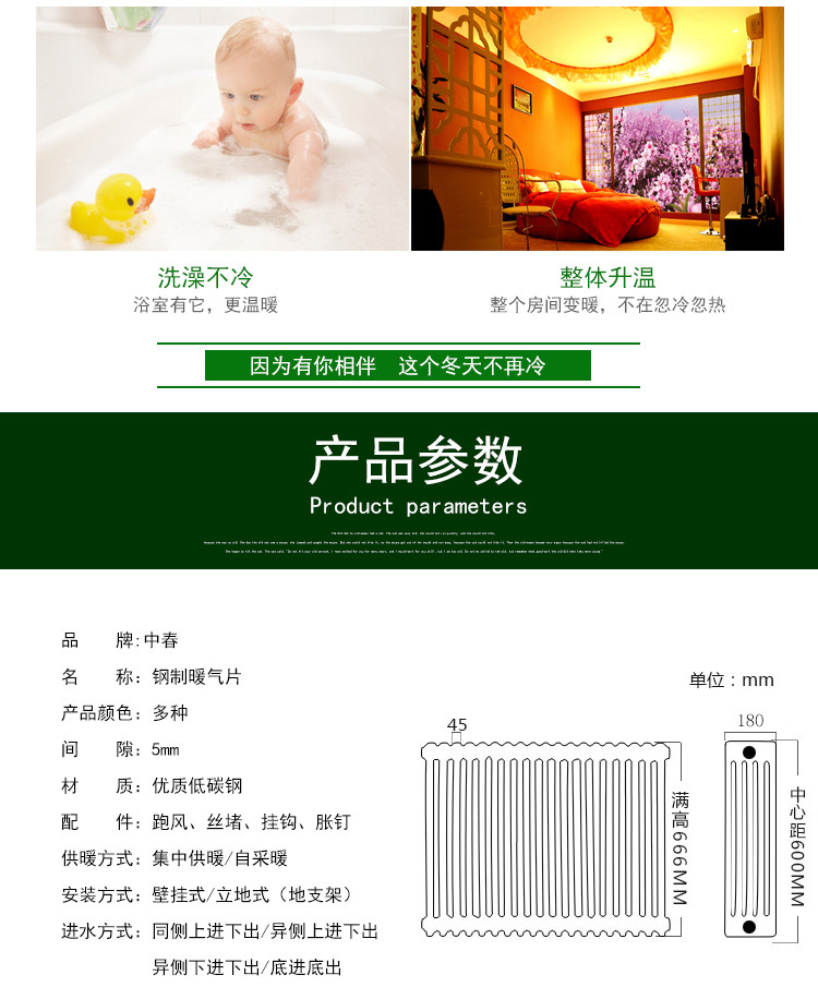 (2)更低能耗,更多省钱采用辐射散热与强制对流散热相结合的原理,设计合理,散热表面积大,大大提高了散热器的热工效率,降低了能耗,同等室温,同等散热效果下,铸铁、钢制片头,双搭散热器的热水用量是该产品的2-3倍,该产品节约能耗50%以上,让用户采暖更省钱。