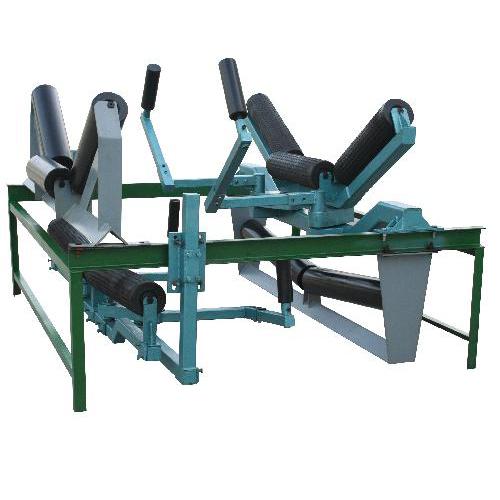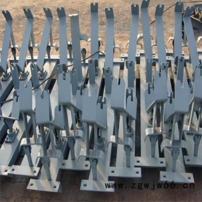 **的托辊支架装置既便于更换托辊的托辊支架装置,涉及有可偏转托辊支架、支座、销轴、机身、托辊,限位块和紧固件组成,支座下端与机身上端用紧固件连接在一起,支座则用销轴与可偏转托辊支架连接在一起,在可偏转托辊支架上设置有托辊。在可偏转托辊支架上,设置有供绕销轴转动的卡槽,托辊则安装在可偏转托辊支架的卡槽中,在可偏转托辊支架上设置有控制偏转角度的限位块。在支座或机身上设置有供可偏转托辊支架绕其转动的销轴,在拆下紧固件的情况下,可偏转托辊支架可以在限位块的控制下绕水平固定的销轴转动一定的角度。 槽型支架属于托辊支架的一种。采用先进的生产工艺,保证产品质量。槽型托辊清除皮带沾物,在斜坡皮带上送力大,阻力小,效果**。双节托辊,能减轻皮带在陶瓷托辊上的重形压力点,托辊中空装置能使带沾物自行掉落,不沾吸托辊,均能延长托辊使用期。