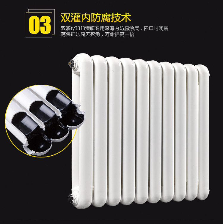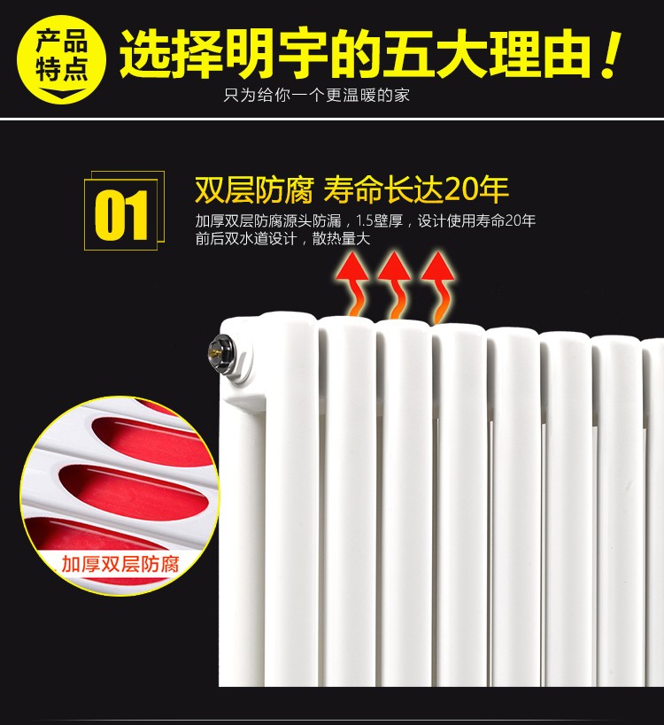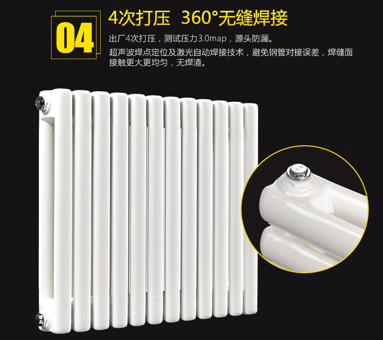 钢制散热器采用**低碳素钢光亮基材壁厚1.5毫米,氩弧自动焊接生产线制造,整体无焊缝片头与椭圆管直接焊接,减少焊点,进一步提高使用安全性,延长产品使用寿命。非强酸除锈,保护基材,锌系磷化处理,增加涂装附着力,三次防漏试压(1.5MPa)工作压力1.0MPa,双重防腐真空罐装,防腐性能优良,表面聚酯树脂粉沫静电喷涂、环保、抗磨划,停暖后,满水保养,使用寿命更长。