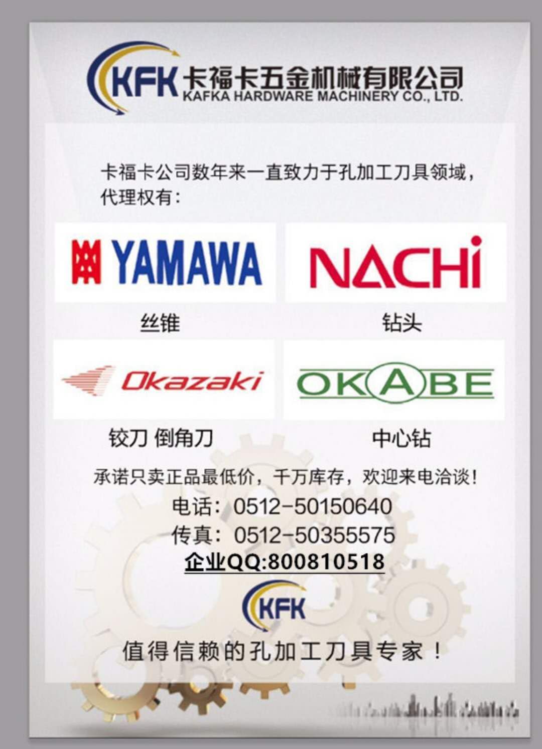 昆山卡福卡五金机械有限公司系日本不二越(NACHI)江苏总代理,YAMAWA丝锥,OKAZAKI岗崎铰刀,OKABE中心钻总代理.