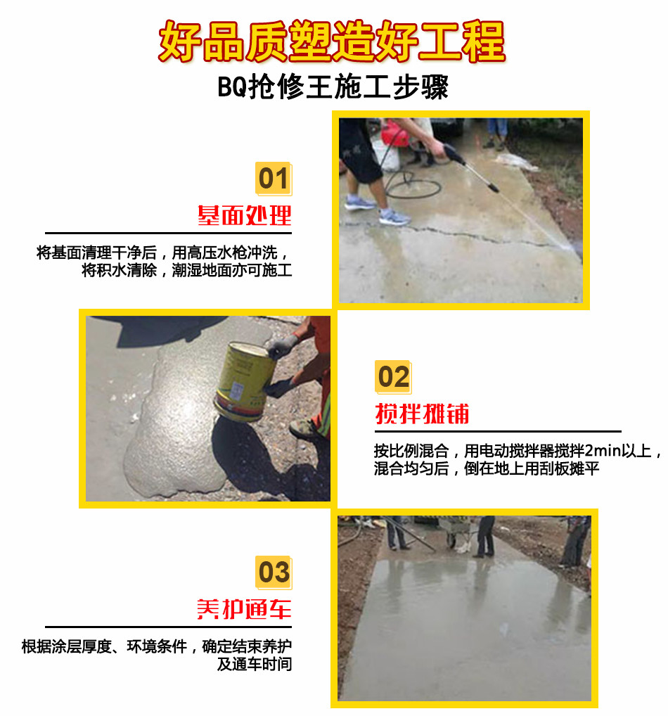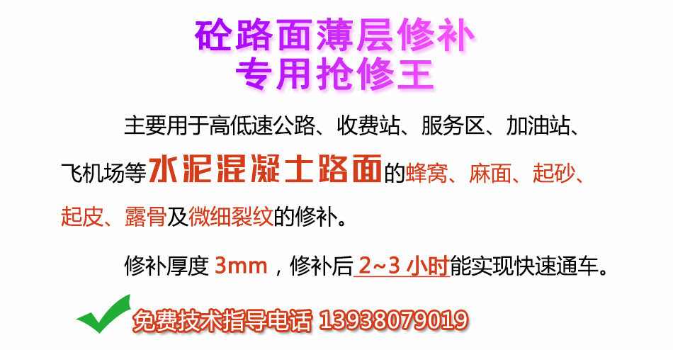 施工时无需复杂的施工机械和技术要求,无需长时间的封闭交通,施工后2小时可开放交通;无需对病害部位开挖,可节省大量的施工费、材料费和养护时间,有效的延缓道路病害的扩散和蔓延,延长道路使用寿命;而且修补后与原水泥混凝土路面颜色接近,有较好的美观度。