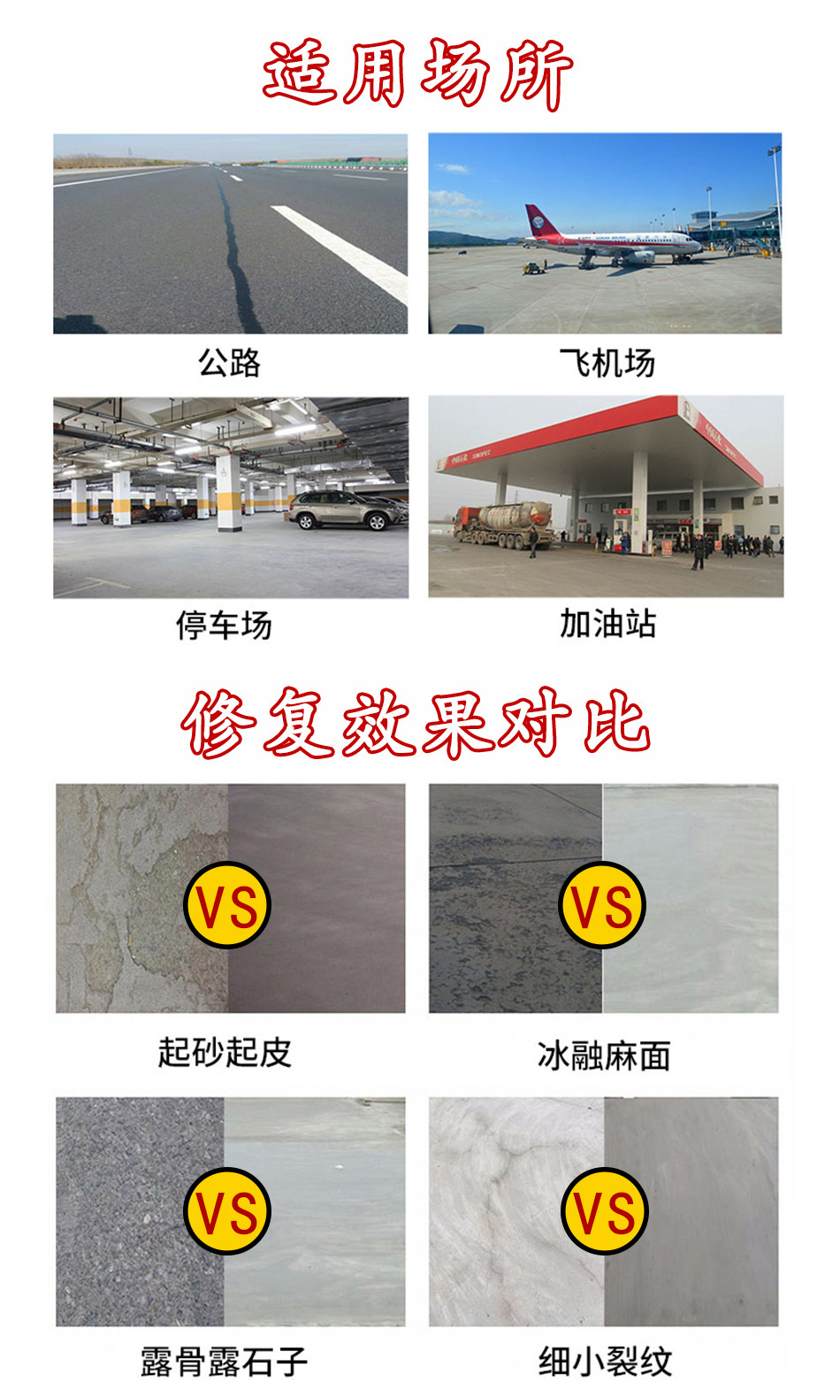 水泥路面修补料专门针对水泥混凝土路面的麻面、空鼓、起皮、脱壳、裂缝、露筋等病害进行及时修补,直接涂抹在病害部位即可,需要有很好的抗压和粘接强度,可实现超薄修补,在高速和高压的行车状态下不会出现破碎和脱落现象;凡是水泥混凝土表面病害均适用于本材料