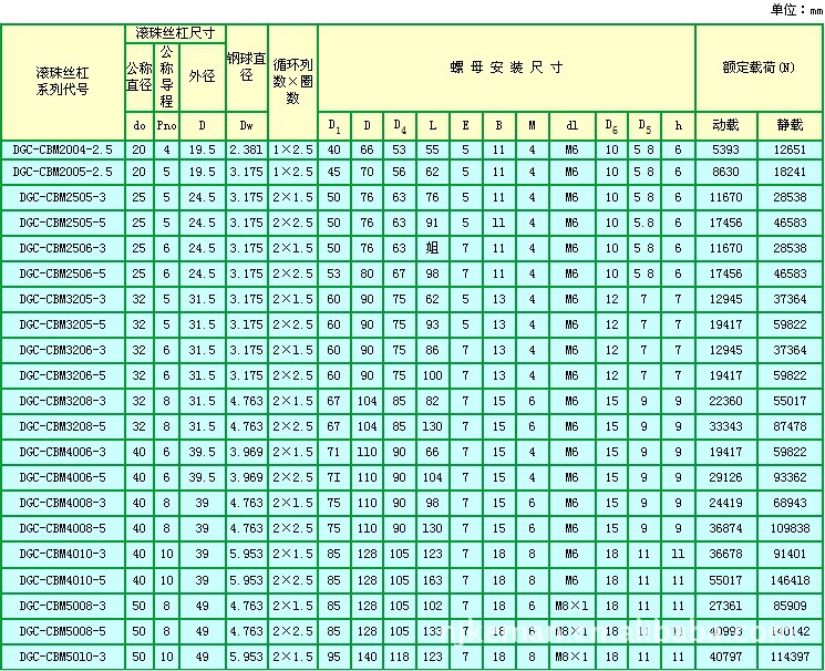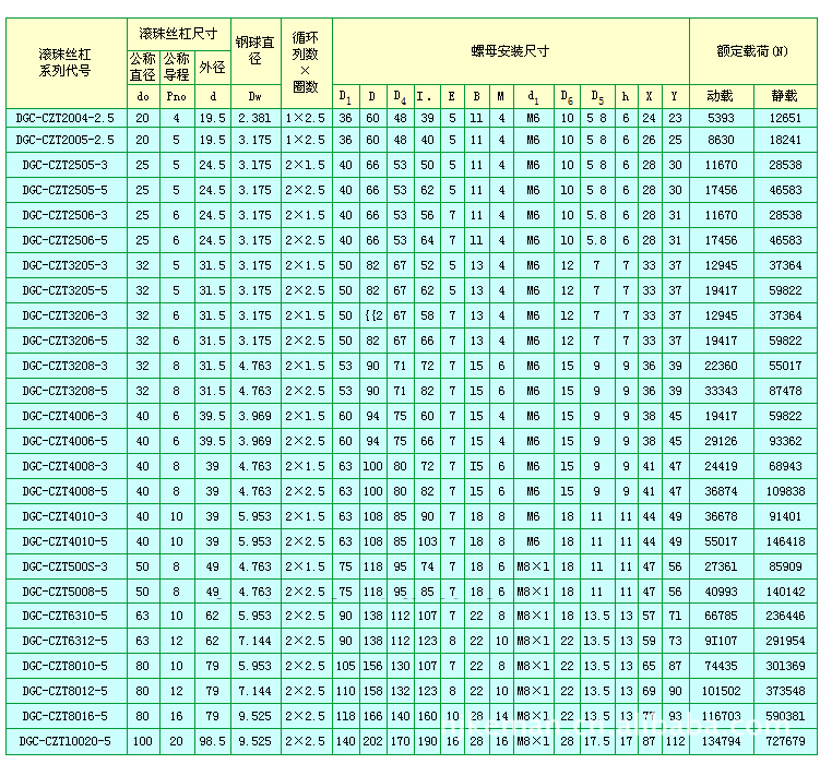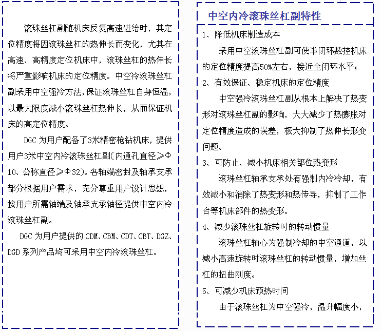 DGC系列滚珠丝杠副涵盖了内循环和外循环的多种型号的多个尺寸系列,以满足高速、重载、微型及超大导程等各种场合需要。为了满足高速与高定位精度机床的特殊需要,本公司还独立开发了中空冷却型滚珠丝杠。此种滚珠丝杠内有通孔,可循环冷却液以有效降低丝杠副温度,减少由于温升带来的丝杠变形,稳定丝杠精度。