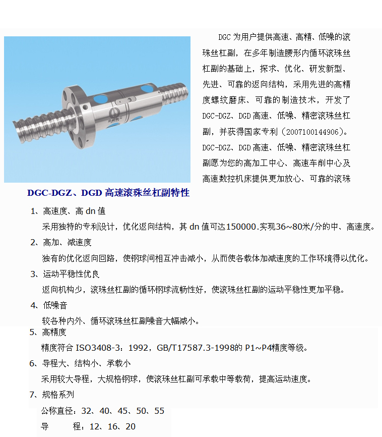 DGC系列滚珠丝杠副采用独特的哥特式沟槽形状,使钢珠与滚道能有**优接触以便顺畅运转;加入适当预紧力可有效消除轴向间隙,减少滚珠与螺母,丝杠间的弹性变形,达到更高的精度。国际**的加工、检测设备充分保证了产品的高精密加工,耐久性使用。