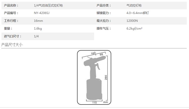 ▲零件均精密加工,精密度高,质量稳定;**新设计,扭力更大,性能更稳定,寿命更长;▲操作容易,轻松方便,噪音低,长时间工作不疲劳;▲适用于汽车、火车、船舶、航空业等钣金紧固连接结构行业;电脑机箱、电器机箱、厨柜等得拉拔紧固;铝合金门窗、室內裝潢等得紧固。气动拉钉枪 【名词解释】 气动拉钉枪:又名气动拉铆枪或气动拉钉机或气动铆钉枪或气动抽芯铆钉枪,叫法不一,是目前国内先进的铆接工具。 【气动拉钉枪工作原理】 气动拉铆枪以压缩空气为动力,通过各个汽缸的串联以达到拉断铆钉的目的,具有拉铆方便,铆接速度快、手持重量轻、无油液损耗等优点。 【气动拉钉枪的用途】 主要用于铝,铁,不锈钢板材的铆接。不锈钢/合金钢拉钉嘴。主要是汽动拉钉,枪拉钉速度快。油压式结构,拉钉力量大。气动拉铆枪广泛适用于装饰装潢、汽车制造及改装、集装箱、电器、家电、仪表、箱包和机械制造等行业,是目前国际**先进的铆接工具之一,目前国内适用量居多的气动拉钉枪品牌主要来自台湾、日本。 【气动拉钉枪适用范围】 1.铝门窗制造业 2.计算机外壳 3.电子制造业 4.其他各种铆接作业 【气动拉钉枪的功能】 一、振动技术提供了从工作环境改造学来说正确的动作,拉钉枪(积累性损伤障碍)的危险性降到**小化。特别针对1/4Magna-Lok结构铆钉、超过3700磅的牵引力、耐受力强的压铸结构以适用于粗糙不平的地方铆钉直径(mm):4.8/6.4(均适用各材质铆钉)**大工具拉伸力N(kgf**大行程(mm):22.0 所需气压MPa(kgf/cm):0.59-0.64(6.0-6.5)每根铆钉所需的空气量:4.6L/铆钉重量(kg):2.9 另外360度旋转气密接合可使工具在工作地点垂直放置 **适合用于被广泛使用的直径2.4到直么4.8的铆钉的铆接作业,长行程化(14-16mm)的设计,大幅扩大了一次性开机的铆接范围,而且速度较以往产品有所提高。 二、自动吸钉,拉钉速度比一般快一倍。自动退钉,连续拉钉作业,不必倒钉,即省时间。采用航空铝材料,轻巧,长时间使用无疲劳感。可调节拉力大小,速度快慢。液压装置无杂音,无后座力等。
