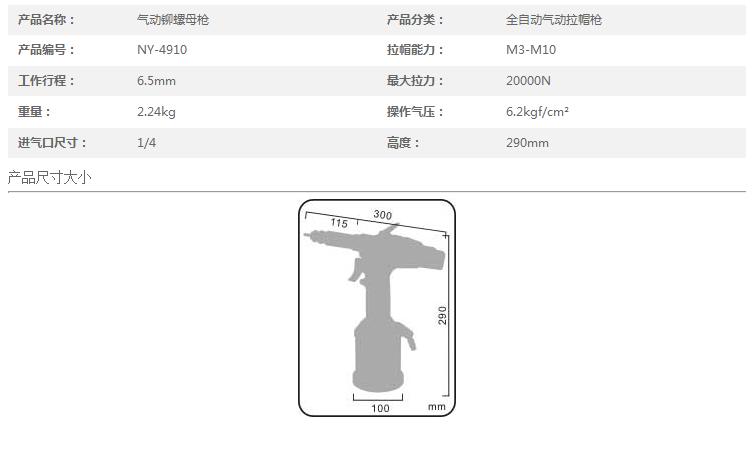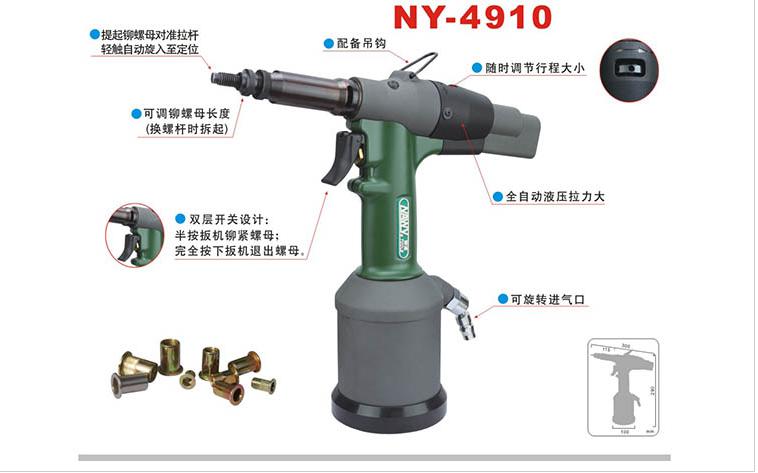●速度快,拉力大,性能稳定可靠,具有自动旋入和退出功能。?本机体采用**合成材料,具有手持重量轻,操作方便、单一开关操作,自动旋入铆螺母,自动拉伸,自动退位,拉铆速度快,铆合紧,不死机等优点,是理想的铆螺母铆接工具。●气动拉帽枪又名铆螺母枪产品用途广泛,例如用于各种不锈钢制品行业,烤炉厂、机箱机械厂、家具厂,机柜厂,中央空调厂,....... 适用于各类金属板材、管材等制造工业的紧固领域。此产品取代传统的焊接螺母,不需要攻牙、焊接,不需要攻内螺纹;弥补金属薄板、 薄管焊接易熔,焊接螺母旋牙不顺等不足之处,使用汽动工具枪铆接,一次到位,方便快捷,美观高效,属时尚新产品。产品质量优异,铆螺母除了可以铆接外,在内部还有螺纹提供连接我们提供不同材料的--铝--钢--不锈钢不同材料的铆螺母具有不同优点:--钢,**常用--铝,重量轻,抗腐蚀--不锈钢,抗腐蚀 ,耐高温铆螺母帽沿形状:平头沉头小头铆螺母铆体:--圆体,带槽或不带槽--六角铆螺母在国外被称为“薄板联接工艺的福音”它改变了传统工艺的旧方式,在薄板上安装零部件时,不需要攻内螺纹,不需要焊接螺母,具有牢固、美观、方便、快捷的特点,铆螺母可以广泛地使用在汽车、航空、铁道、制冷、电梯、开关、仪器、家具、装饰等机电和轻工产品的装配上。