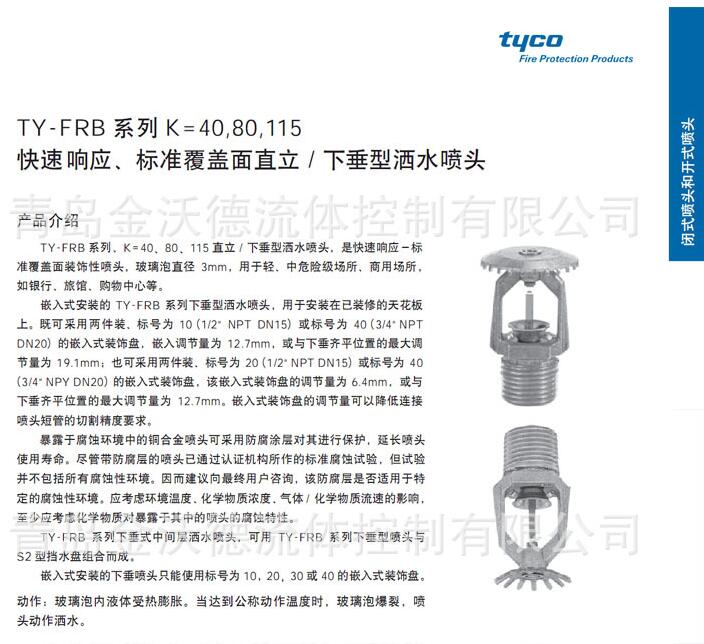 TY-FRB 系列、K=40、80、115 直立 / 下垂型洒水喷头,是快速响应-标准覆盖面装饰性喷头,玻璃泡直径 3mm,用于轻、中危险级场所、商用场所,如银行、旅馆、购物中心等。