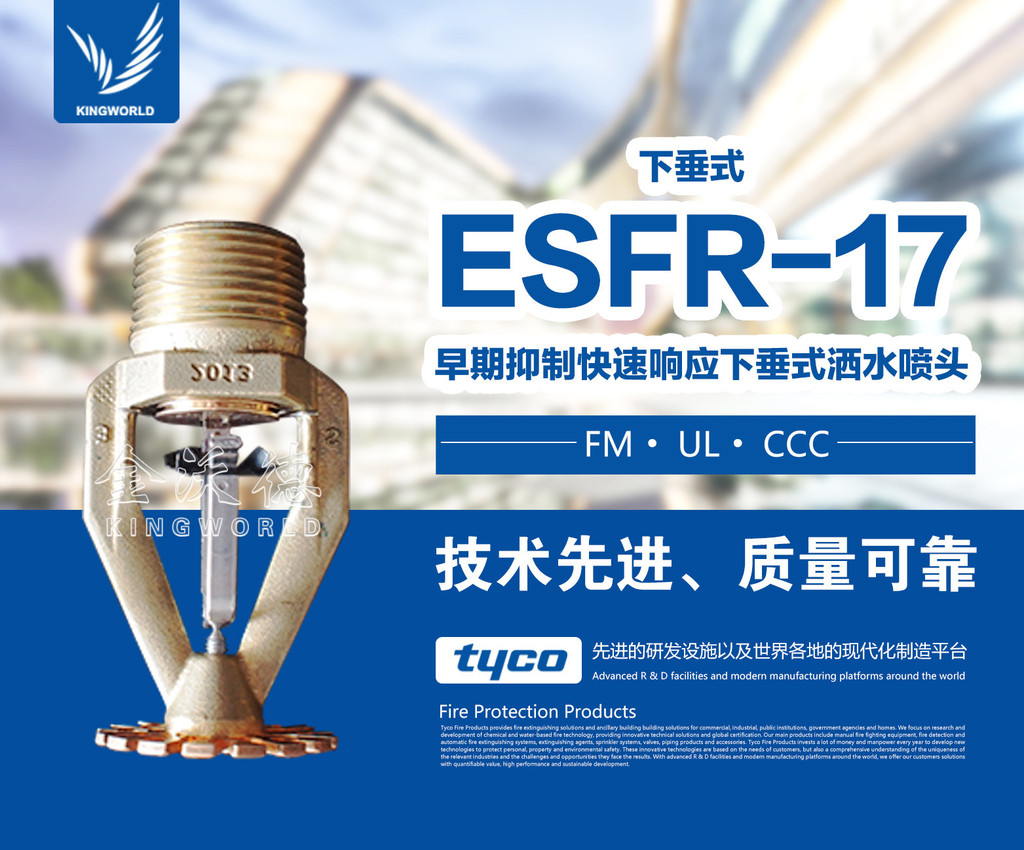 ESFR-17直立型喷头是快速响应早期抑制喷头(K=242),对保护高货垛仓库具有特殊的优势,而不需再装设货架内喷头。