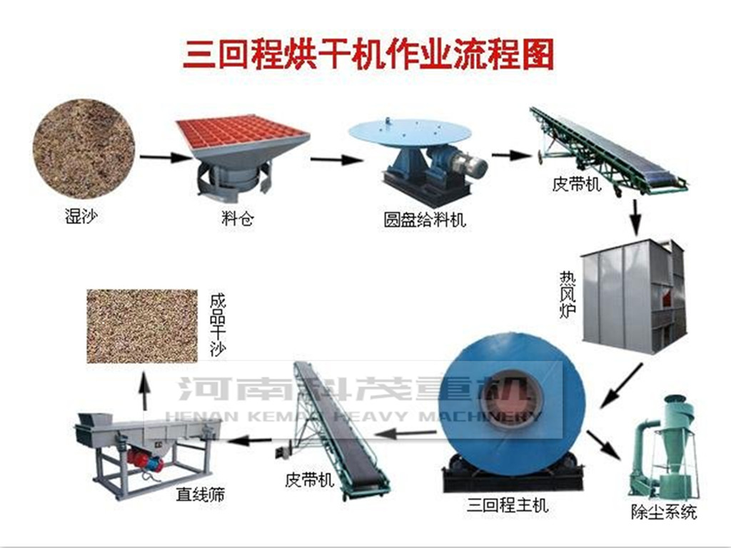 三回程烘干机简称三筒烘干机是一种处理大量物料的干燥器,运转可靠、操作弹性大、适应性强、处理量大。三筒烘干机一般适应于颗粒状物料。特别是烘干沙子,三筒烘干机其优点是生产能力大、适用范围广、流量阻力小、操作上允许波动范围较大、操作方便等。常用于烘干河沙、人工砂、石英砂、矿粉、炭渣等。