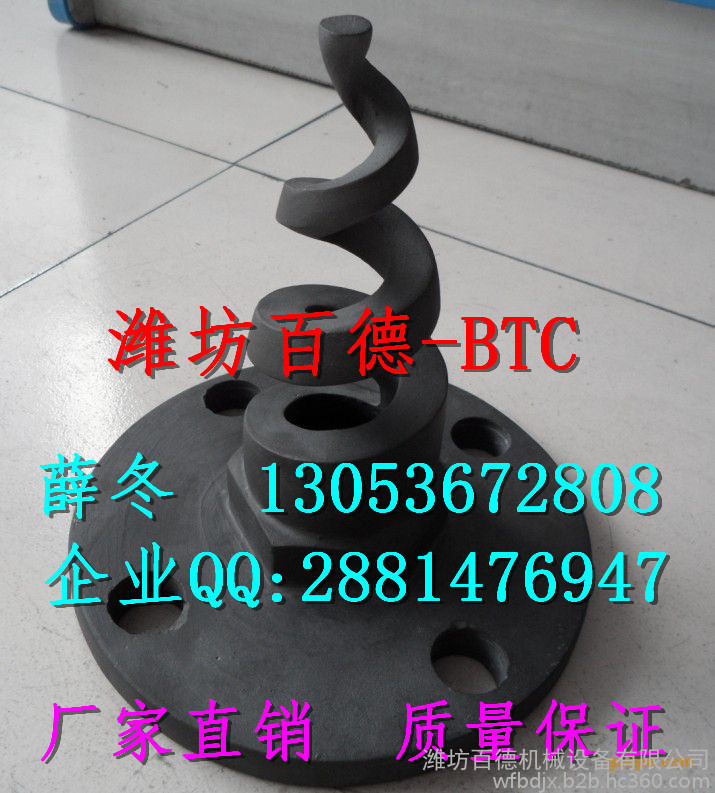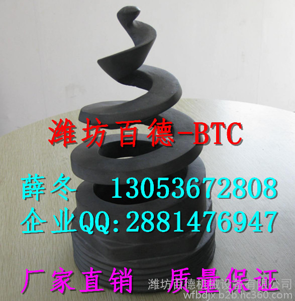 碳化硅螺旋喷嘴工作原理,螺旋喷嘴是众多喷嘴中**有特色的一种。随着连续变小的螺旋体,浆液不断经螺旋线相切和碰撞后改变方向成片状喷射成同心轴状锥体,不同层椎体喷射面流线与喷嘴轴心的夹角逐层减小,而且液体在从进入喷嘴腔体到出口的通道内均没有受到任何阻碍。且在很低的操作压力下仍具有很高的吸收效率,获得了脱硫系统的普遍认可。